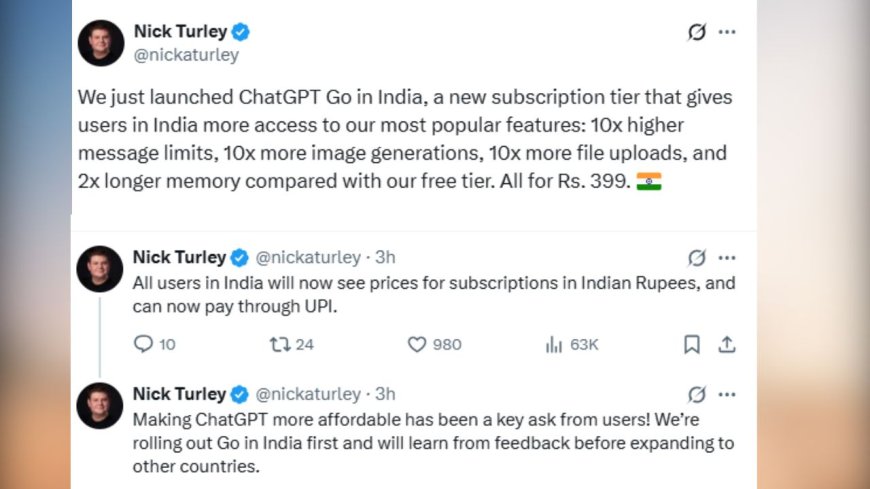இதுக்குறித்து OpenAI-யின் துணைத் தலைவர் மற்றும் ChatGPT தலைவர் நிக் டர்லி கூறுகையில், ”இந்த 'ChatGPT Go' திட்டம் முதலில் இந்தியாவில் அறிமுகப்படுத்தப்பட்டு, பின்னர் மற்ற நாடுகளுக்கு விரிவுபடுத்தப்படும். இந்தியப் பயனர்களிடமிருந்து வந்த மிகப்பெரிய கோரிக்கைகளில் ஒன்று, ChatGPT ப்ரீமியம் அம்சங்களினை பயன்படுத்துவதற்கான விலையினை, இந்திய மதிப்பில் நிர்ணயிக்க வேண்டும் என்றுதான். இந்த புதிய திட்டம் இந்திய பயனர்களின் கோரிக்கைகளை நேரடியாக பூர்த்தி செய்வதோடு, அவர்களின் நம்பிக்கையினை பெறவும் வழிவகுக்கும்” என்று தெரிவித்துள்ளார்.
