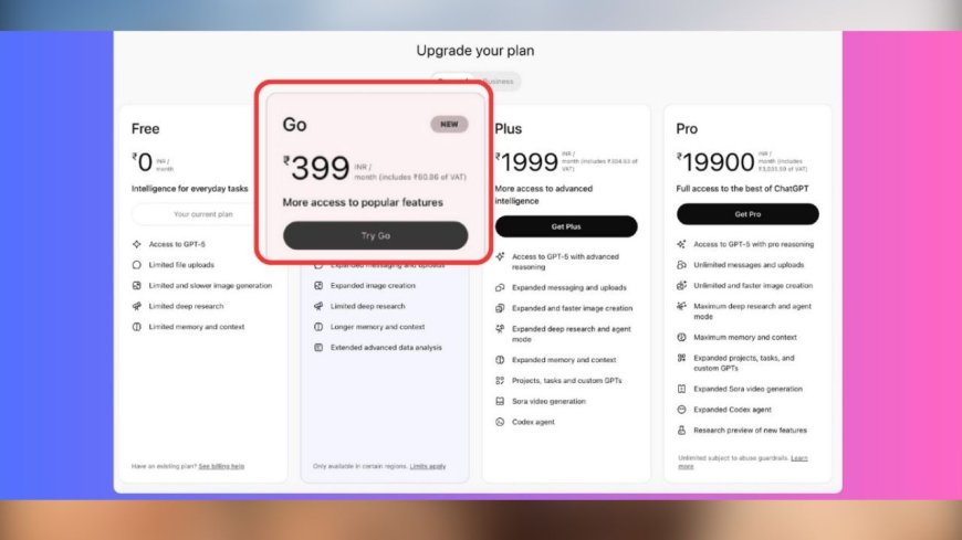 தற்போது, ChatGPT-ல் நான்கு திட்டங்கள் உள்ளன: பயன்பாடு வரம்புடன் கூடிய இலவசத் திட்டம், புதிய 'Go' திட்டம் ₹399, 'Plus' திட்டம் ₹1,999 மற்றும் 'Pro' திட்டம் ₹19,999. இப்போது அறிமுகம் செய்யப்பட்டுள்ள 'Go' திட்டம், இலவச மற்றும் 'Plus' திட்டங்களுக்கு இடையிலான இடைவெளியை நிரப்பும் என OpenAI நிறுவனம் நம்பிக்கை தெரிவித்துள்ளது.